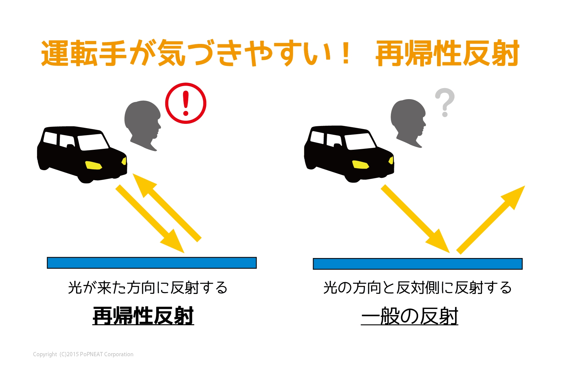 光の来た方向に反射する再帰性反射材を使用。 昼間は黒く目立たないテープが、 夜間は光を白く反射し、 運転手に存在をアピールします。