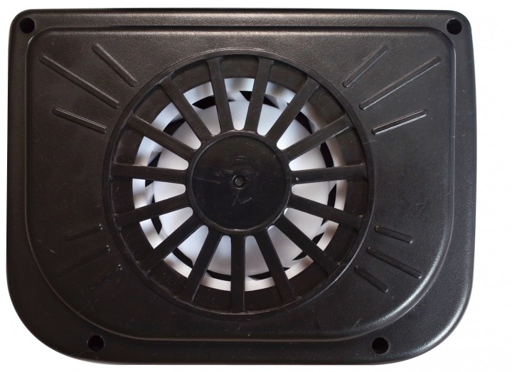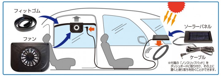 クルマの窓にパッキンとなるゴムとファンを挟み込み、日差しのよく当たる場所にソーラーパネルを置いて、あとはケーブルをつなげば簡易換気扇の完成。