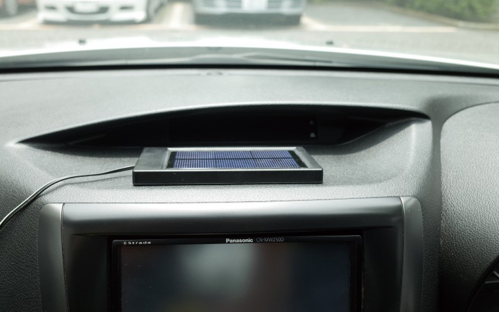 ポイントはソーラーパネル一体型ではないこと。やはり、より多くのエネルギーを得るなら、パネルは最も日が当たる場所が一番。ケーブルは230cmあるので、パネルをダッシュボード上に置いても後席の窓まで届きます。