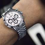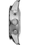 時計ケースとブレスレットはステンレススチール製で、ケースサイズは43.5mm径×厚さ12.7mm、100m防水を搭載しています。セラミック製のベゼルにはタキメーターが刻まれ、両面無反射コーティングのサファイアクリスタルガラスがクリアな視界を生み出します。ブレスレットは5連タイプで、サテン仕上げとポリッシュ仕上げの組み合わせがスポーティーで男性的な印象を与えます。