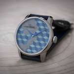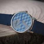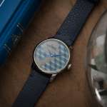 ダイヤルにはだまし絵を思わせるモダンな幾何学パターンがアシンメトリーに配置されていますが、これはひとつひとつ緻密に切り出された70以上もの小さな木片によって構成されたもの。