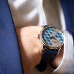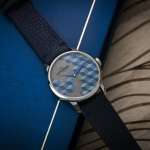 立体的な図柄をいっそう引き立てているのは、木目の質感を残して施された濃淡ブルーのグラデーション。ダビドフのシガーボックスやリュージュのオルゴールなど、スイスを代表する数々の高級ブランドに提供されてきたシュバリエ氏の匠の技が、直径42mmの小さなダイヤルの中に存分に発揮されています。
