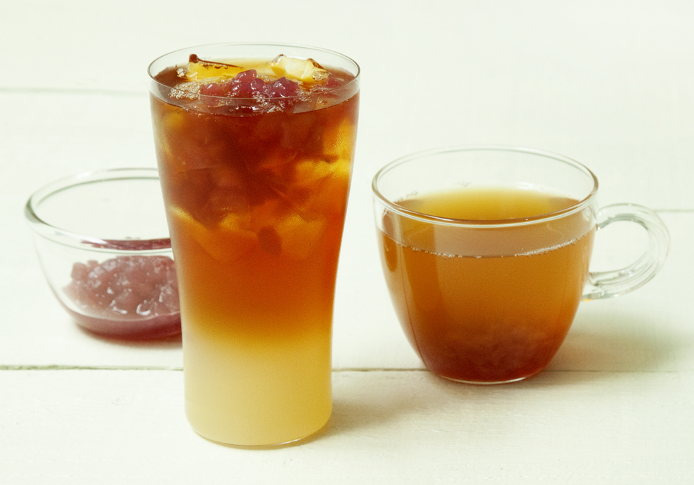 アップルブランデーを思わせるフレーバーティーに、赤葡萄果汁で風味づけしたアップルコンポートをトッピング。りんごのほのかな香りとシャキシャキとした果実の歯ごたえも楽しめる。