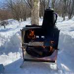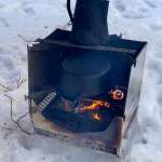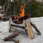 組み立てた状態での外形寸法は520×305×365mm、薪をくべる炉も幅420×奥行305mmと余裕のあるサイズで、40cmの長い薪も横向きにすんなり収まる大容量です。基本的な構造は同ブランドの人気商品・フォールディング薪ストーブ「G-neo」の構造を応用したもので、バラバラに解体したパーツは全て底板裏に収められるようになっています。全パーツを収納すれば厚さ23mmまでスリムになるから、市販の薪や大きく太い枝を使ってダイナミックな炎を楽しみたいソロキャンパーはまさにうってつけのチョイスです。