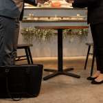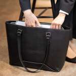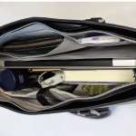 ボトムの汚れ防止カバーは、マグネットでバッグ本体にくっついていて、簡単に接地する面を切り替えられる構造となっています。汚れた地面に置いて底面が汚れてしまった場合でも、カバーの向きを変えることで、瞬時に汚れた面を隠して、キレイな面が露出。こうすれば、気兼ねなく膝の上にも置けますし、取引際に来訪する際に汚れた部分を見せずに済みます。汚れてしまった面は、のちほどウェットティシュで拭けばまた清潔な状態に。