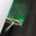真っ先にチェックしておきたいのが、新しくなった“Fluffy Optic クリーナーヘッド”の存在です。特別な光を照射することで、肉眼では見えにくいこまかなチリや毛髪などを見つけやすくするという基本的な機能は従来モデルと同じものですが、光源を従来のレーザー光からLED光に変更したことで、より広い範囲が照らせるように。これによって従来比でおよそ2倍のホコリが可視化できるようになっています。