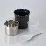シンプルなデザインで、カラーはホワイト、ブラック、ブルーの3色展開。ふたは外して丸洗いできるので、清潔に使えます。便利な計量カップと「小型IH炊飯器」のスリムな釜にあわせた「専用しゃもじ」が付属します。