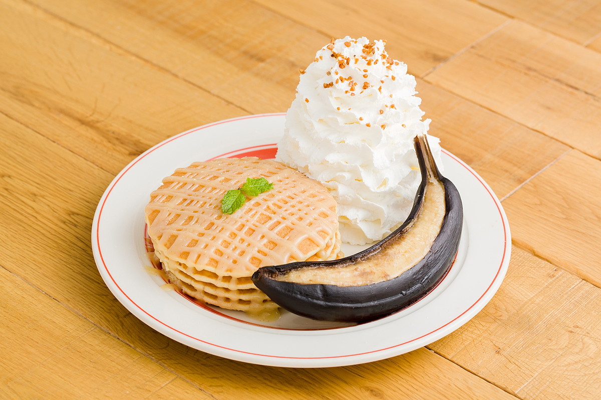 ひとつ目の新作は「キャラメルハニーパンケーキ with ベイクドバナナ」(1566円)。お馴染みのパンケーキに、はちみつを使用した自家製生キャラメルソースをたっぷり! 添えられたベイクドバナナは、オーブンで焼き上げることで濃厚な甘みと香りが引き立ち、とろけるような食感!