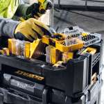 「TSTAKキャディボックス」はスケルトン仕様で小物の整理に便利な「タフケースプラス(小)」と「バルクケース」をボックスにしっかりと固定できる、専用スロットを搭載したシステムケース。ツールボックスをひとつにまとめられるので、現場での運搬をこれまで以上にスムーズに行えます。