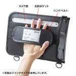 背面側にはカメラ窓が備わり、ケースから出すことなくカメラ機能を活用可能。名刺ポケットが付随したハンドベルトが配置されており、片手持ちでも安全にタブレットを操作できます。