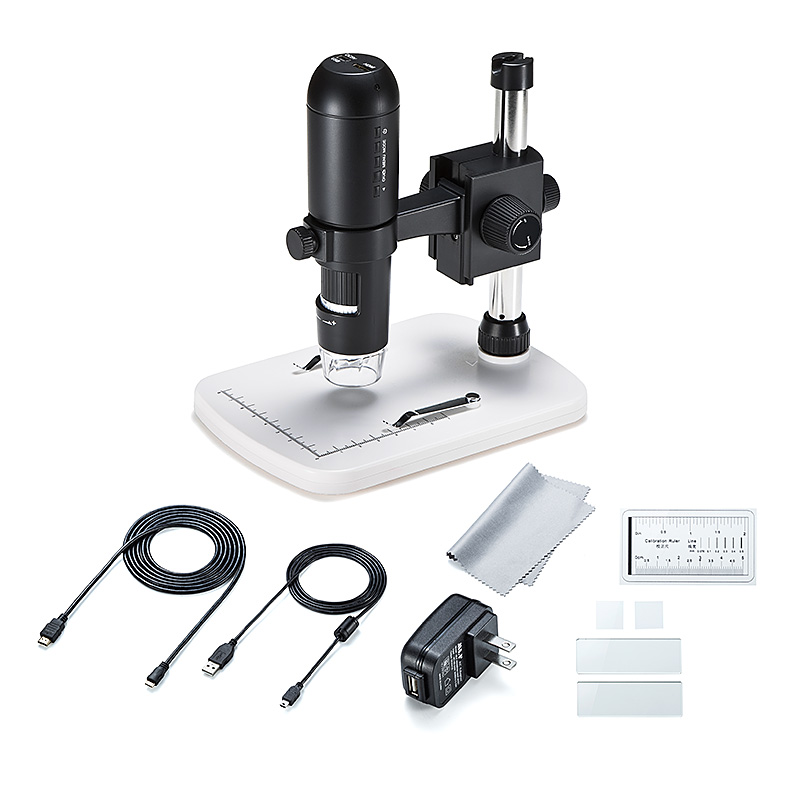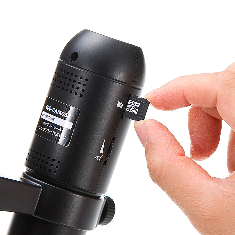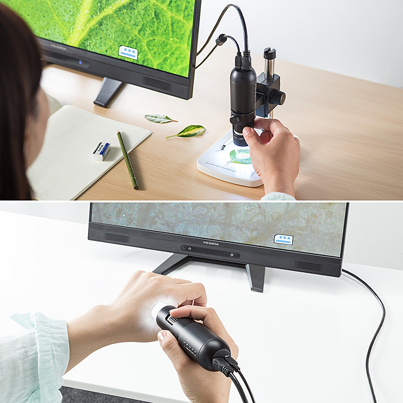 一般的な顕微鏡はスタンドにスコープが固定されている場合がありますが、 本製品はスコープをスタンドから取り外しでき、 人の手や壁などスコープ固定式では観察しにくい物も自由に観察する事ができます。また、スタンド固定ならば、 しっかり安定した撮影が可能になります。