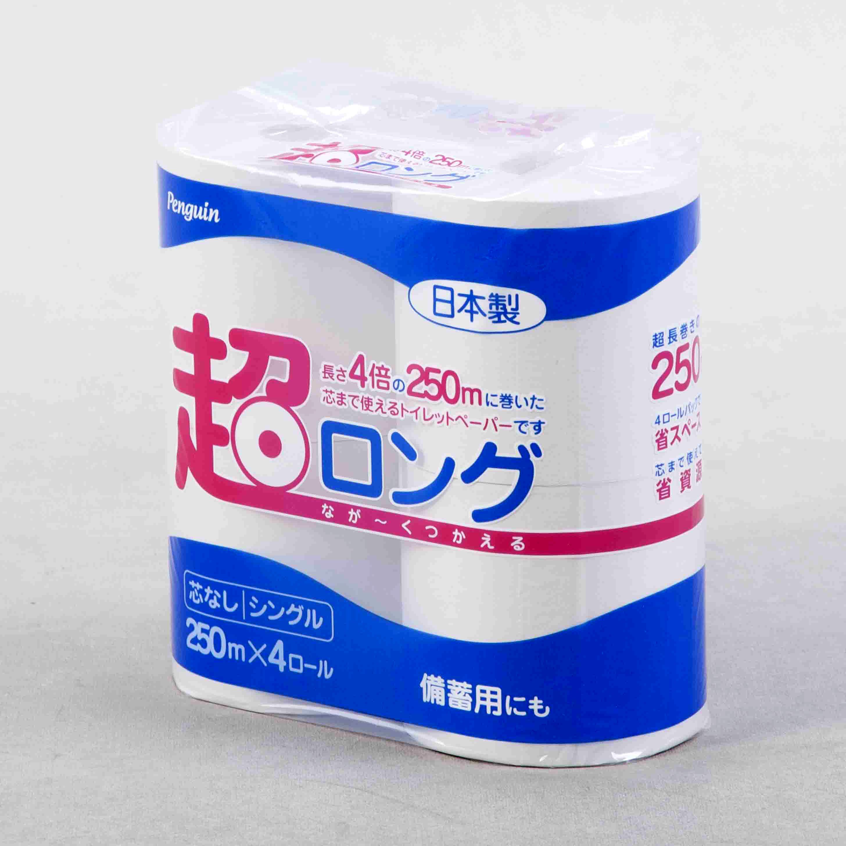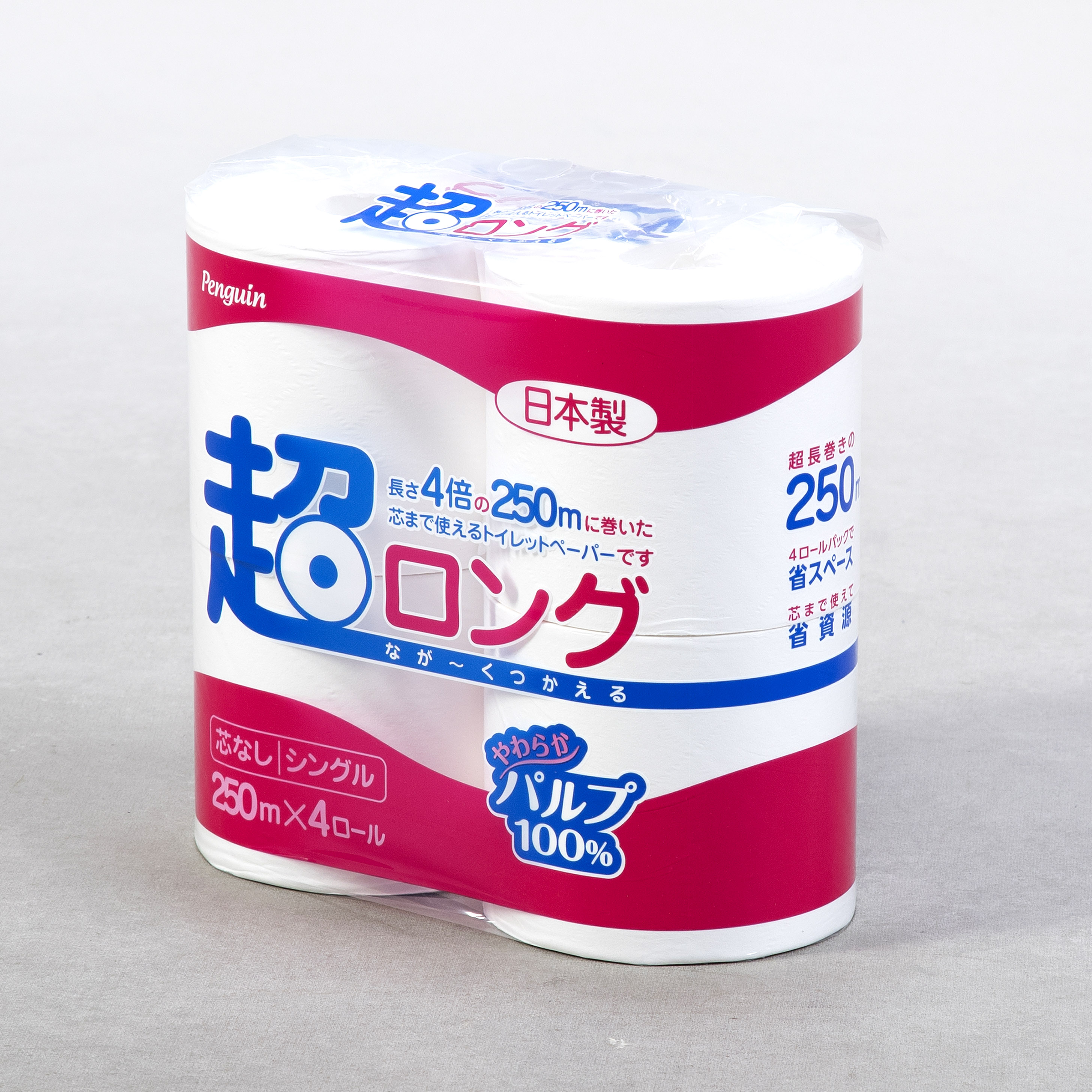 「ペンギン芯なし超ロング 250m4R シングル」 (107mm×250m) 環境にやさしい再生紙100%使用。 再生紙ならではの、 丈夫でしっかりとした紙質が特徴。