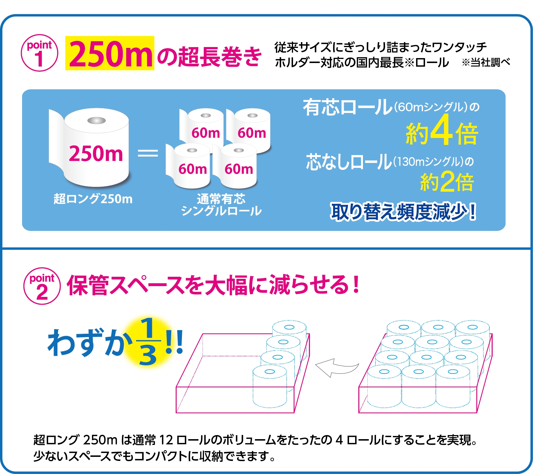 通常使うトイレットペーパーはこれまでのモノにして、いざという時のために「超ロング」を4~5ロール置いておくというのも、場所も取らないしアリかもしれませんね。