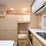 居住スペースは大きく分けて、運転席側の上部にあるバンクベッド、中央のリビング、リアの2段ベッドの3つ。リビングを全面フラットベッドにしたり、リアの2段ベッドを取り外して収納スペースにしたり、乗車する人数やシチュエーションによってアレンジできます。なお、住居スペース内のシートにはフェイクレザーが使われているため、手入れがしやすいのもポイントです。