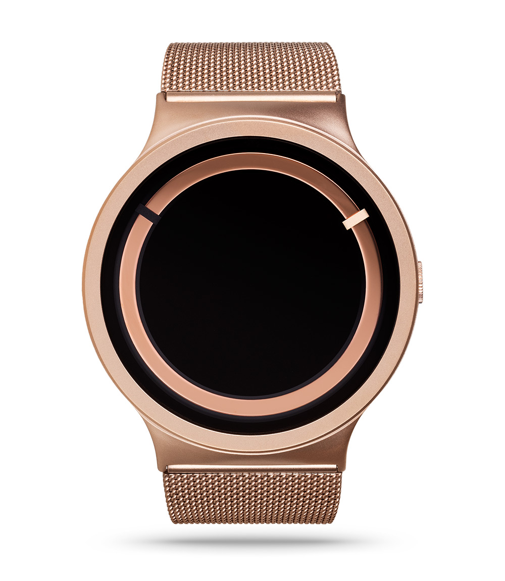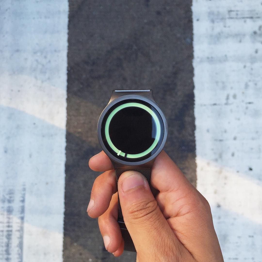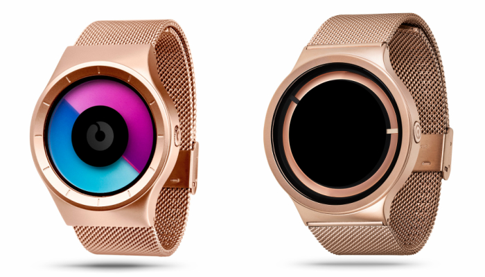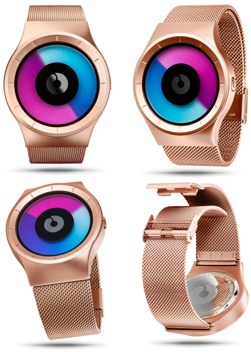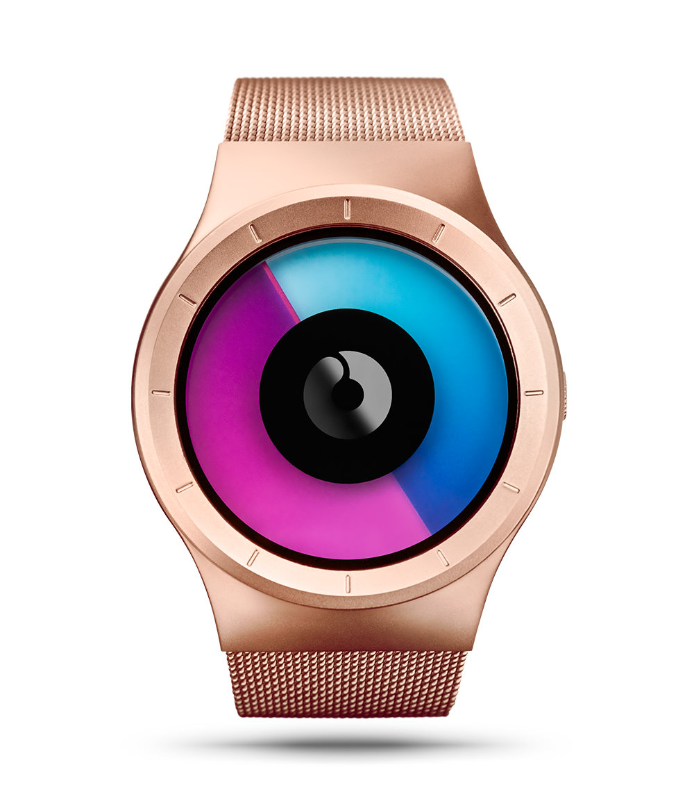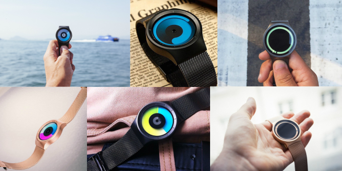 ドイツ発の「ZIIIRO」は時間を楽しむための腕時計。短針・長針ではなく、柄の変化で時刻を表現します。例えばCELESTEシリーズは、オーロラの配色を再現したデザイン。2枚のグラデーションディスクの色の変化によって時刻を表示するのですが、以下の時刻、読み取れますか?