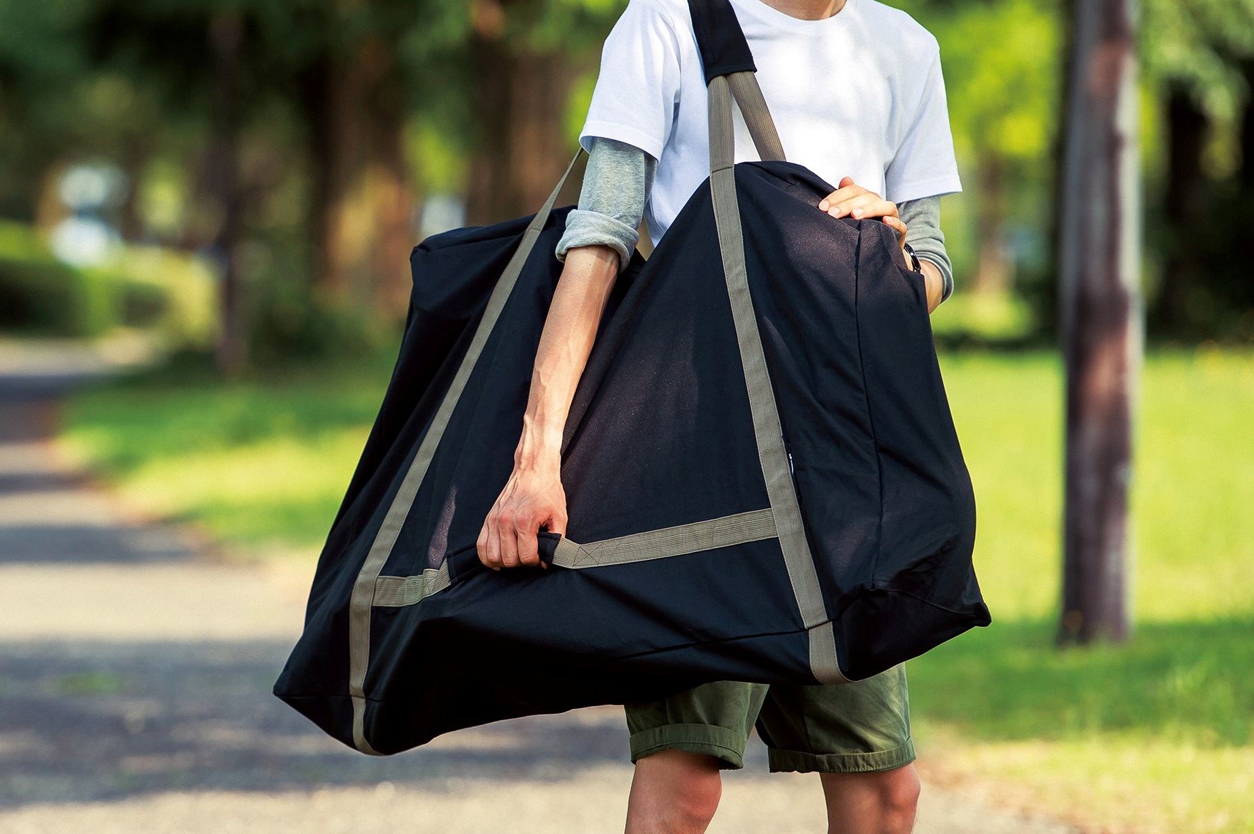 さらに、オプションとしてアウトドア仕様の専用バッグ(2980円)も用意。トートバッグ型のバッグの中に自転車を収納が可能です。肩にひもをかけて使うだけでなく、バッグに開口部を設けて自転車の持ち手を直接つかめるように工夫もされており、収納ポーチも付いているので便利。