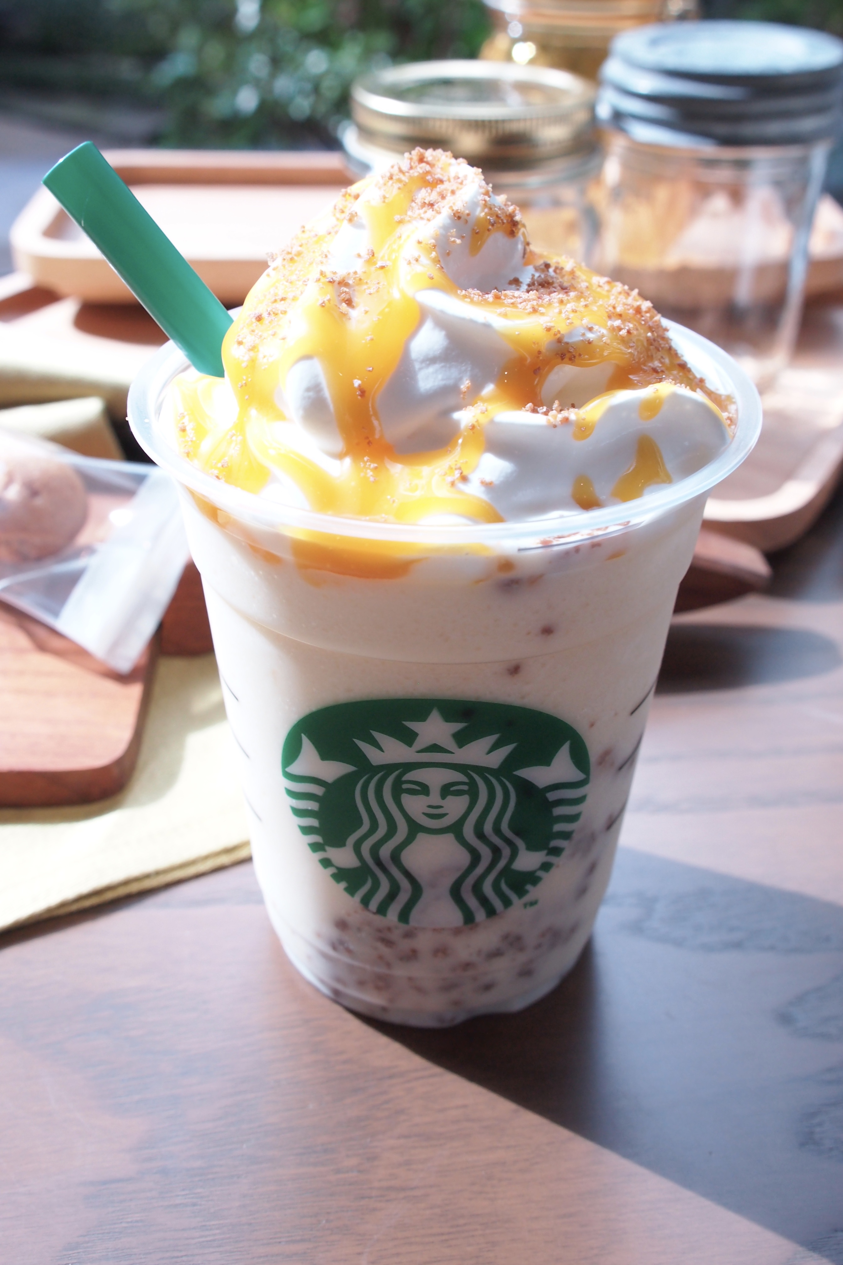 「ゴールデン メイプル フラペチーノ with キャンディーウォルナッツ」は、メイプルシロップにハニー、バター、くるみのペーストを使用した「メイプルハニーバターソース」をドリンクのベースにブレンドし、キャンディコーティングされたクルミを混ぜ込んだ季節限定のフラペチーノ。表面のソースがゴールドに輝いて、見た目にも美味しいドリンクです。