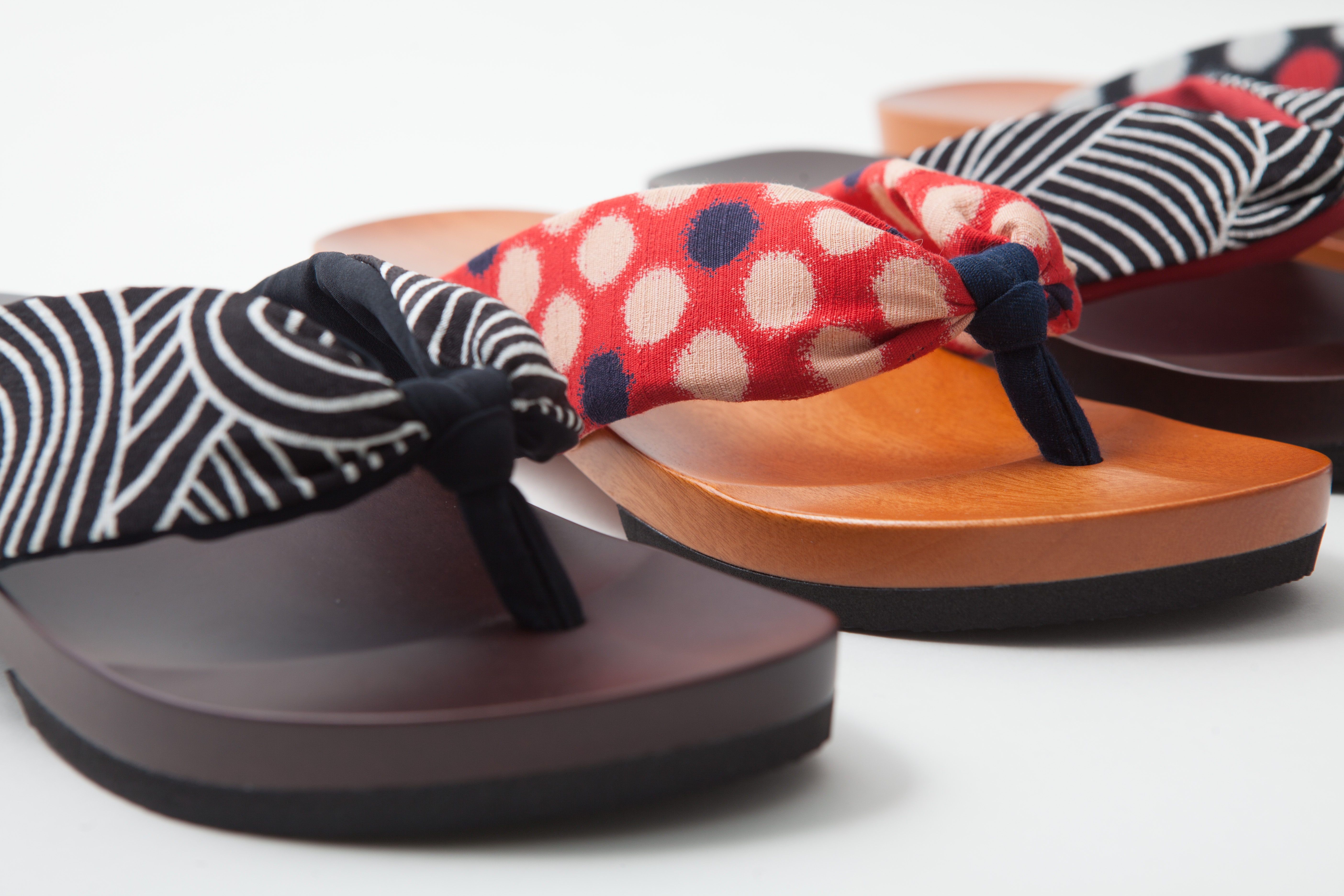 鼻緒部分はドット(白/黒)、波(赤/黒)、ビー玉(赤/黒)、シフォンカーフ合皮(赤/黒)の4柄8種類、いずれも性別や年代を問わず、モダンで選びやすい柄が揃う。サイズはS(23.0~24.0cm)、M(24.5~25.0cm)、L(25.5~26.0cm)、LL(26.5~27.0cm)の4種類。価格は各1万584円。