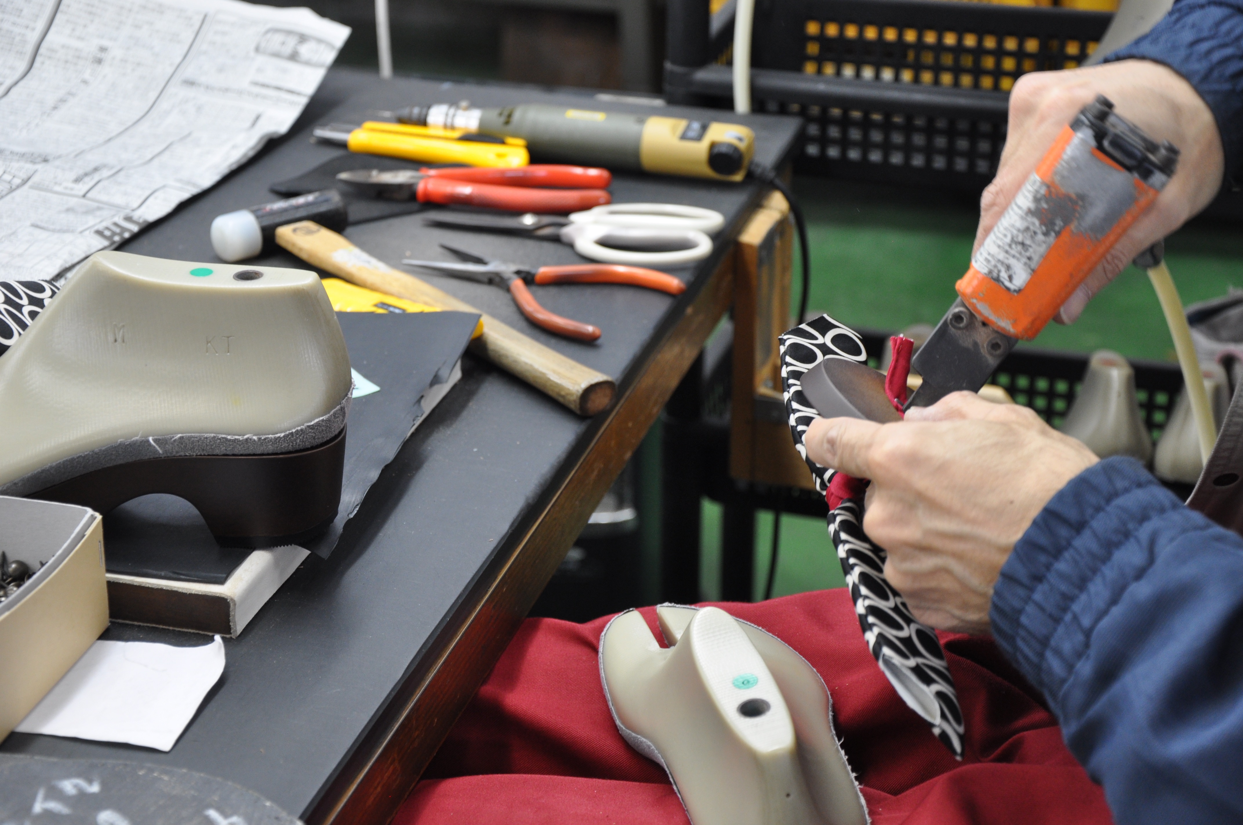 接地面の素材は厳選に厳選を重ねた結果、肉厚で柔らかな約6mmのクッション素材に。木地には、硬くて丈夫な高級木材・マホガニーの無垢材。そしてヒールの高さは約3.5cmと、低くくすることで男女兼用で使えるようになっている。