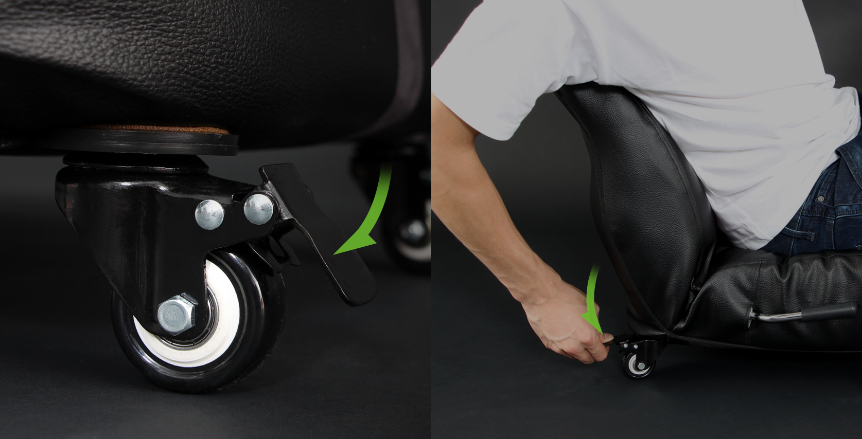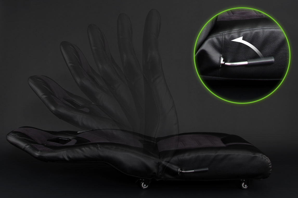 コックピットさながらのバケットシートデザインで、フルフラットにできるリクライニング機能は6度ずつ14段階に調節することができる。キャスターで前後左右に移動できるから、着座位置やコントローラーポジションの微調整も自由自在。キャスターは好みの位置でロックして固定することもできる。