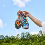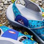アッパーには、青や水色をベースにカラフルなドットをちりばめ、脱ぎ履きを簡単にするバンジーシューレースには、黄色や赤などのカラーを採用してアクセントをプラス。アッパー内側サイドには、特別なフジロックロゴを配置しています。