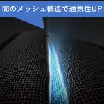 さらに、左右のパーツ間にはメッシュ素材を使用することで通気性もアップ。バッグ背面にもメッシュ素材を採用し、背中の蒸れを抑えます。