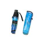「長傘」(3630円)は、あえてカジュアルなイメージのビニール傘をベースに、ビーチをモチーフにした永井氏らしいアートワークを全面にあしらっています。8枚パネルのうち1枚だけは無地のブラックを採用、ハンドルなどのパーツも同じくブラックで揃えることで、甘くなりすぎない大人っぽい雰囲気に仕上げています。