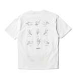 背面に配されたグラフィックデザインは、自転車に乗っている際に使用する、右折・左折・停止などのハンドサインが表現されています。サイクリストに役立つプリントかと思いきや、ひとつだけ“キツネ”のハンドサインが紛れているのがニクい!