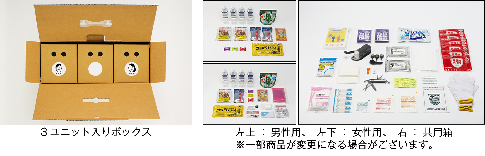 セット内容は、多機能ラジオライトや救急セット、非常用トイレなどが入った「共用箱」が1セット。そこに、防災の専門家が、長期保存の食料や水のほかに各々の属性にマッチしたアイテムを厳選した「男性用」「女性用」「シニア用」「キッズ用」の4種類から、2種類を選んで組み合わせます。こうして、ユーザーのスタイルにぴったりな全3ユニットのセットを完成させる形になります。