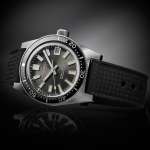 太く角ばった時分針やどっしりと厚みのあるラグ、秒針の先に備えた矩形のポイントなど、60年代らしい郷愁を誘うディティールが満載ですが、ダイヤル・ベゼル・ストラップを黒一色で統一したスタイリングのおかげで古びた印象を感じさせません。水辺で過ごす休日のラフなスタイルはもちろん、スーツの手元に合わせても新鮮な魅力を放つ一本。