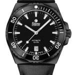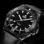 ステンレススチール製の時計ケースは40mm径のコンパクトな設計。ブラックのPVD加工により硬度が高められ、セラミック製のベゼル、厚さ2.5mmのサファイヤクリスタルガラス風防(無反射防止加工)、リューズガードを備えたねじ込み式リューズなど、各所に堅牢性を感じさせます。