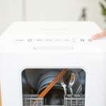 サイズはW308×D315×H41mmで、重さは8kg。一人暮らしのキッチンにも置きやすい大きさながら、12点の食器に加えてカトラリーも一緒に洗浄できる大容量を実現。食器を設置して水を注ぎ、ボタンを選ぶだけで自動洗浄します。