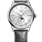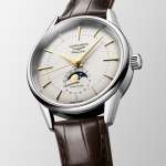 ラインナップは、オパーリン加工が施された乳白色のダイヤルにゴールドの針やインデックスを組み合わせた「オパーリンシルバーモデル(L4.815.4.78.2)」と、サンレイ加工が施されたダイヤルをはじめ、全体をシルバーで統一した「サンレイシルバーモデル(L4.815.4.72.2)」のふたつ。なお、オパーリンシルバーモデルにはブラウン、サンレイシルバーモデルにはグレーのアリゲーターストラップが装着されています。
