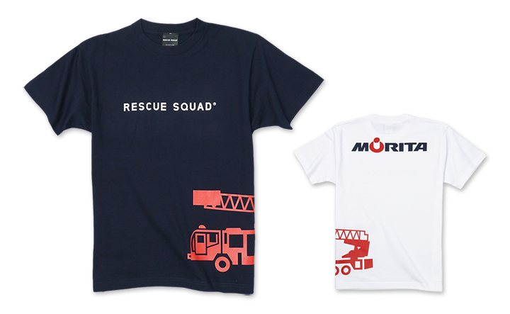人気ブランド「RESCUE SQUAD」とのコラボTシャツ「Wネーム・モリタTシャツtypeⅡ」(3780円)。白やキッズサイズ(3132円)もあります。