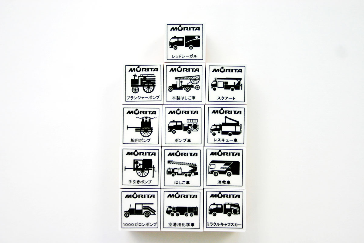 その一方で、自社の商品に親しみをもってもらう狙いもあって、オンラインショップの『MORITA NETSHOP』にて、オリジナルTシャツやストラップ、消防車のミニカーから、消防車焼印入りのせんべいまでも発売されています。