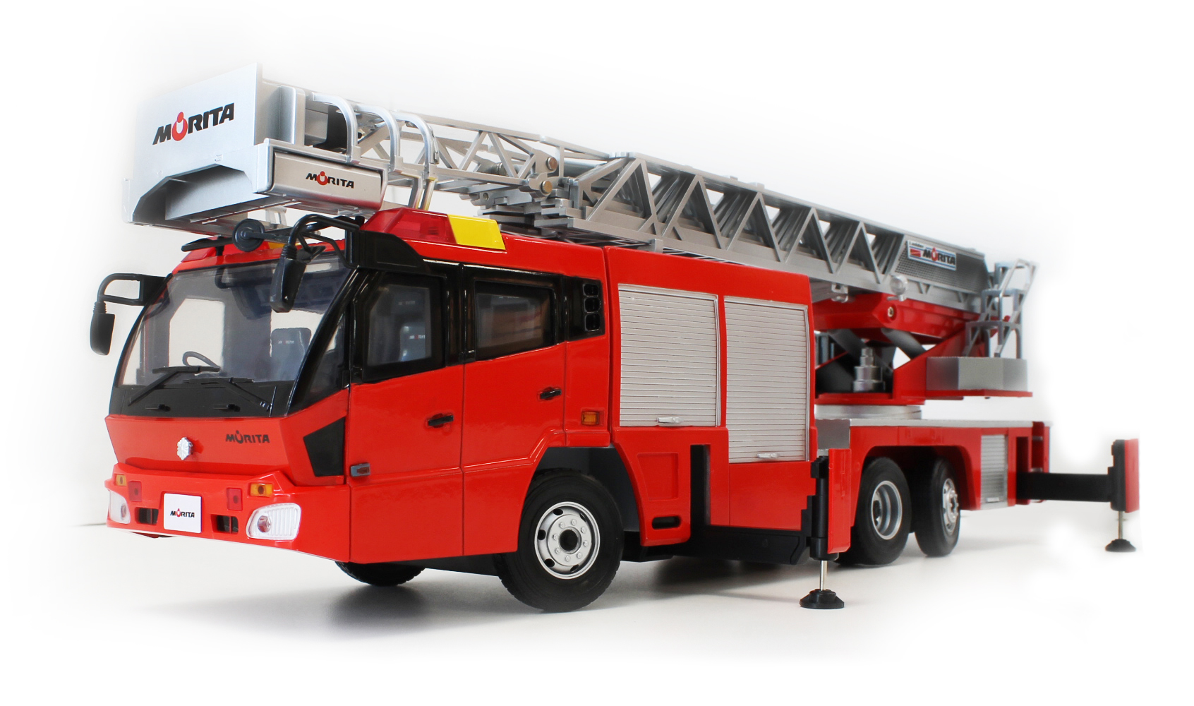 超精巧に作られたモリタの最新式MLLシリーズはしご車の1/32モデル。全長 約330mmのビッグサイズ!アウトリガーが張り出し、4段式のはしごが伸縮します(5万2500円)