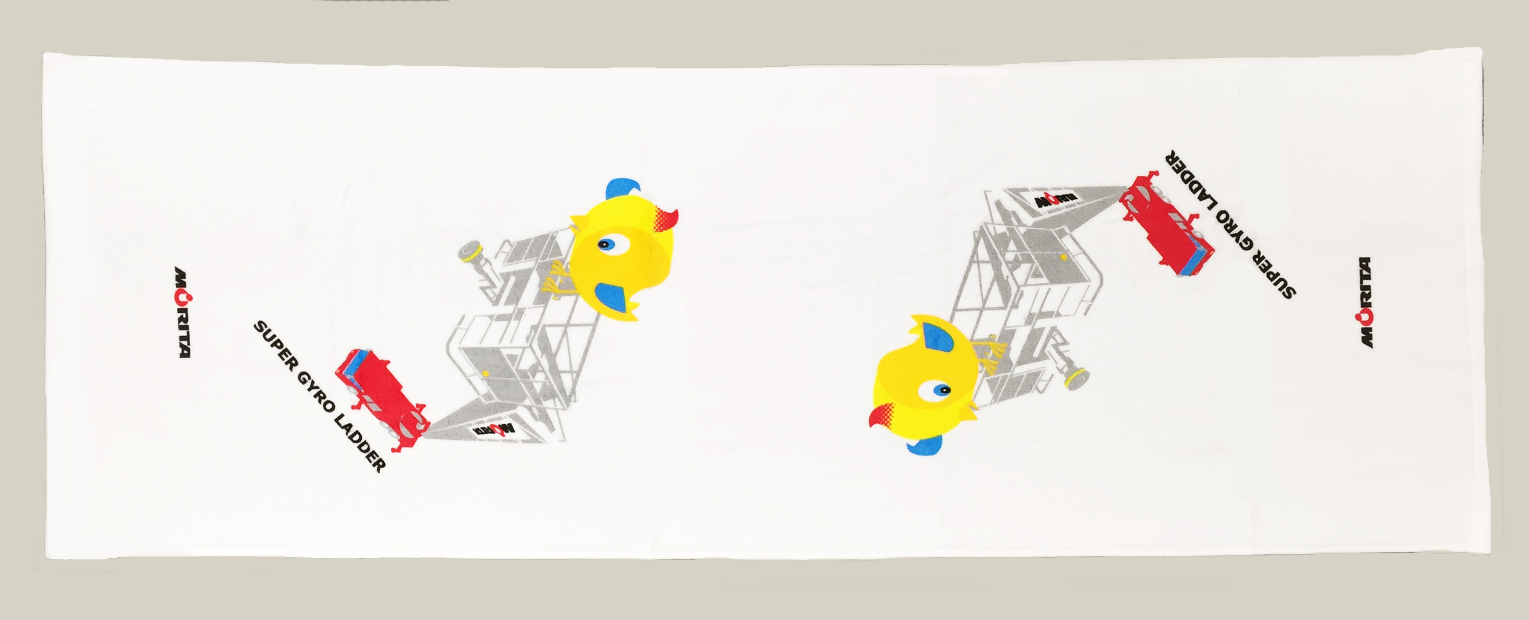 モリタの主力製品であるはしご車「スーパージャイロラダー」と小鳥がイラストで描かれた大判のタオル。9月1日発売の新作です!(1080円)