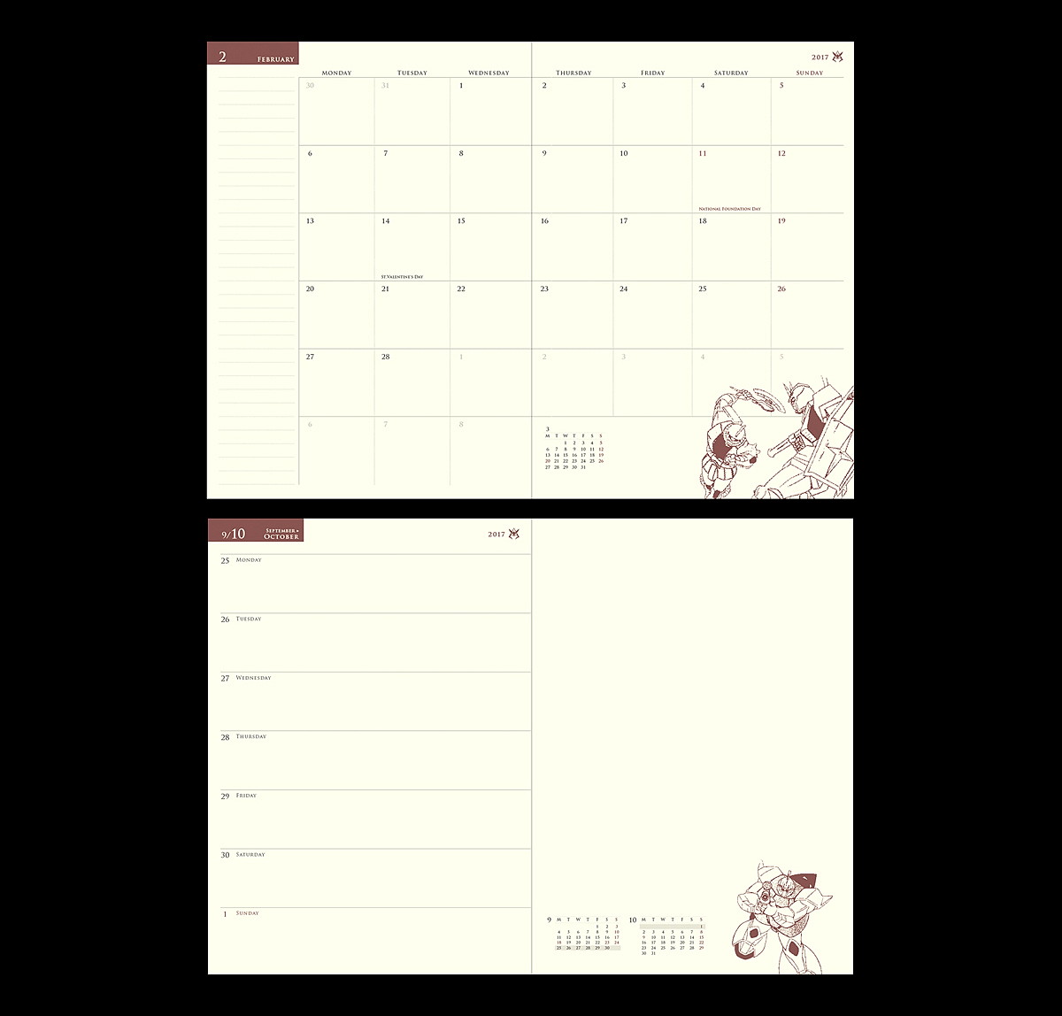 見開き1カ月の月間ページ右下には、シャア専用モビルスーツの劇中アートが月替りでプリント。レフト式(左ページがホリゾンタル、右ページがフリースペース)の週間ページ右下には、シャアの活躍シーンを時系列に掲載。計52週にわたり、一年戦争の流れを追っていけるニクい仕掛けだ。