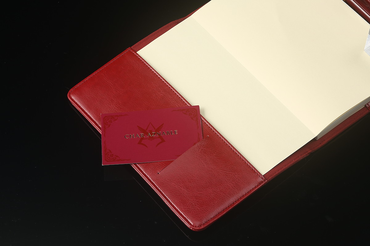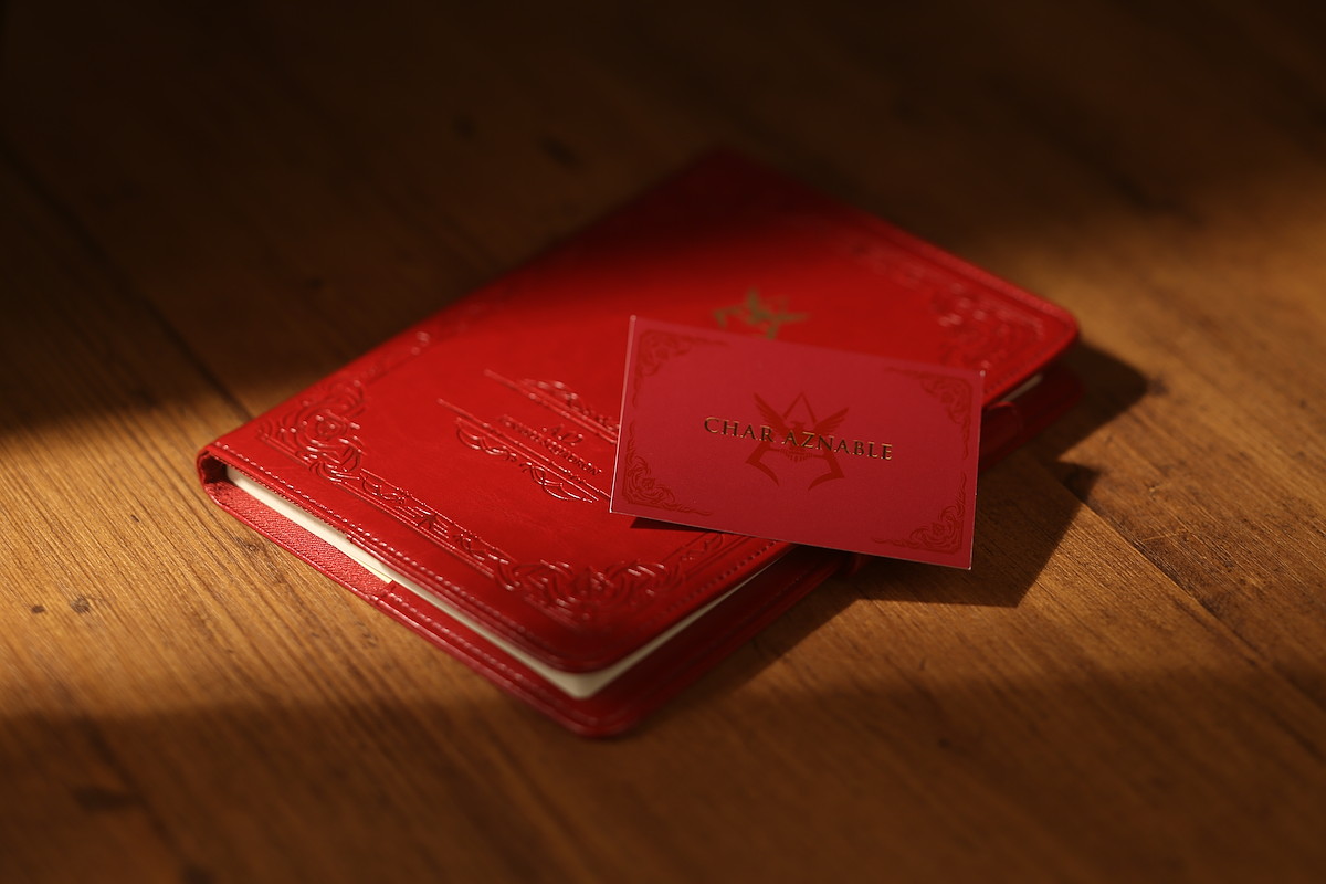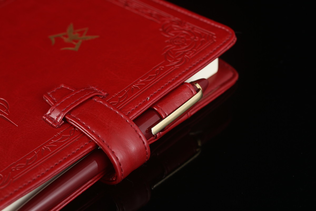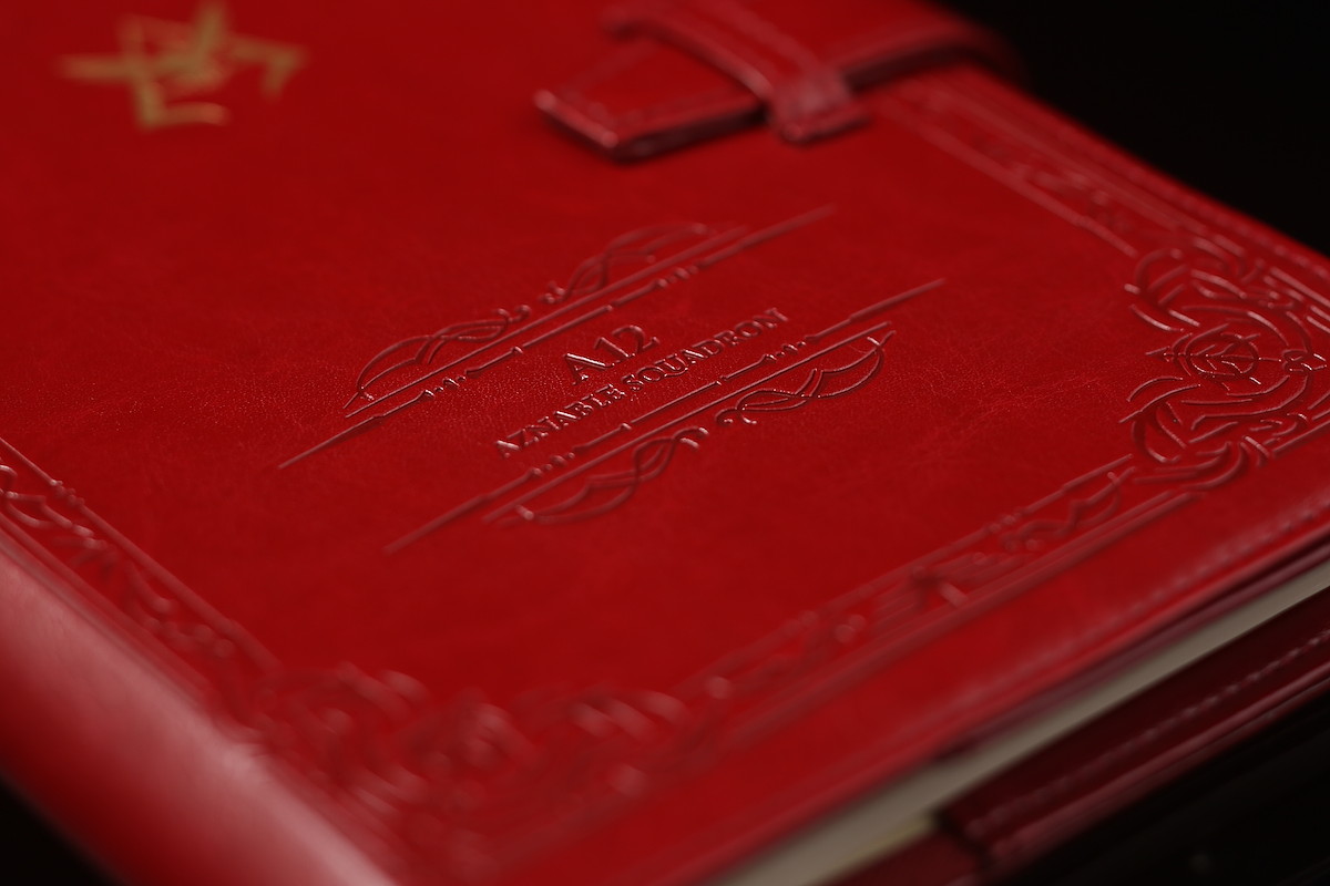 カバーは当然ながら赤。しかもビジネスシーンでも使いやすいように、深い色の赤を採用している。さらに、表面にはつや消しの金色で箔押しされたパーソナルエンブレムをあしらい、所属部隊『A12』を型押し。裏面には、ジオン公国軍のエンブレムがあしらわれている。
