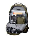 裏地に耐久性の高い420Dリップストップ素材を採用したメイン収納部は、容量約20L。16インチまでのノートPCが入るスリーブや、ジッパー付きポケット、オープンポケット、メッシュポケット、ペンスロットなど数多くのポケットを配置し、上部にも防犯性の高いトップポケットを備えています。