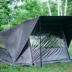 まず目を引くのはユニークなフォルム。4本のポールで立ち上げられたボックス型の形状は、ダークグレーのカラーも相まってどことなく小屋っぽい外観。秘密基地を思わせるルックスは眺めているだけでなんだかワクワク。設営した状態でのサイズは幅300×奥行き410cmで、高さは195cm。室内にはコットを2台おけるだけの十分な広さを確保しています。
