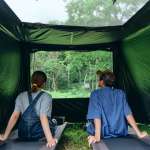 特筆すべきはテント前後に設けた大きな開口部と、天井部分に備えた天窓の存在です。メインの出入口となるフロント部分は高さを出して解放感を演出。全ての窓をフルオープンにして風を通せば、暑い季節も涼しく快適に過ごせるし、テントに居ながらにして外の風景をメッシュ越しに楽しむことも可能。晴れた夜ならテントの中で、星を眺めながら眠りにつくこともできそうです。