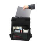 「移動文房」は、オフィスや出先、自宅などのデスクや作業スペースに置ける自立構造で、必要なものをすぐに取り出せます。収納スペースは3エリア。ガジェットケースとメイン収納スペース、PCポケットに分かれています。