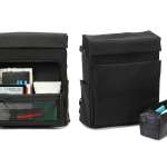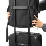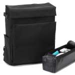 サイドポケットには、ペットボトルや折りたたみ傘を収納可能。サイドポケット上部のマジックテープを使えば、三脚も固定して収納できます。背面はスーツケースに固定できるベルト付きで、出張時にも活躍。