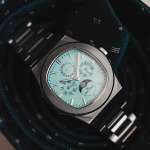 基本的なダイヤルの構成要素は、ブランドのオリジンである「クラシック・パイオニア」と同じもの。3つのサブダイヤルで表現されるカレンダー表示や、6時位置のムーンフェイズも健在ですが、インデックスや針などのディテールはよりカジュアルでスポーティなデザインへとアップデート。これにより、スーツはもとよりビジネスカジュアルなど幅広い装いに合わせやすくなっています。