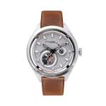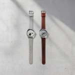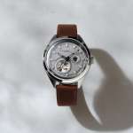 ダイヤルの外周はシースルーで軽やかな印象。シルバーのステンレススチール316L製時計ケースに、イタリア製レザー(ブラウンとグレーの2色で展開)を組み合わせ、全体的に落ち着いた佇まい。ケースサイズは41×厚さ15mmで、腕元をすっきりと見せます。
