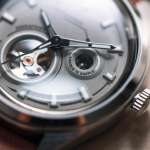 ダイヤルの素材には、「中銀カプセルタワー」の外壁をイメージした、凹凸仕上げのコンクリートを採用。円形のオープン部分によりムーブメントの機構をうかがえるオープンハート仕様で、大小2つの円形デザインはカプセルの象徴的な「窓」を想起させます。