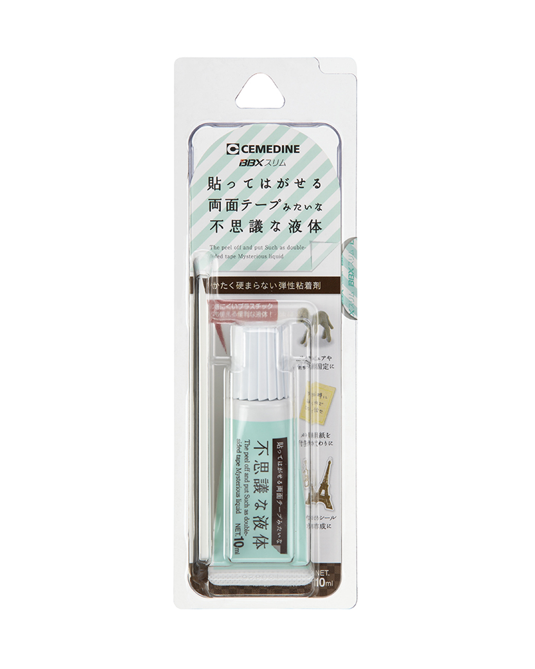 セメダインの「BBXシリーズ」は、実は2013年にすでに発売されいている。だが、あまりの便利さゆえに今一度紹介したい。一般の接着剤のように樹脂状にガッチリ固まるのではなく、糊のように粘着性を保ちながら固定するから、ゆっくりはがせばキレイにはがすことができるのだ。使い方は、塗ってしばらく放置し、のりのようなベタベタ(粘着性)な状態になったら貼るという使い方。