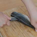 重量は110g、元々のイカ割き包丁と比べるとやや重厚感がありますが、一般的な和包丁に比べると軽い部類に入ります。刀身が厚く短いため重心が手元に近く、軽い力で魚がさばけるのもメリットのひとつ。