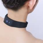 首に巻くだけで使えるUSB充電式のチョーカー型「ネックマッサージャー」は、首の後ろにあるふたつの通電部から出る低周波刺激で筋肉のコリに直接アプローチ。いつでもどこでも好きなタイミングで使えるように開発されたものです。